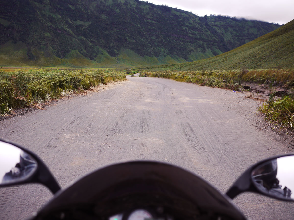 Pagi-pagi buta, gw mulai perjalanan ke Bromo. Satu jam berselang, jalan mulai menanjak dan menurun, motor gw terjatuh di sebuah tikungan yang licin. Untung ga ada kerusakan parah, dan kaki cuma keseleo sedikit. Lanjut lah.